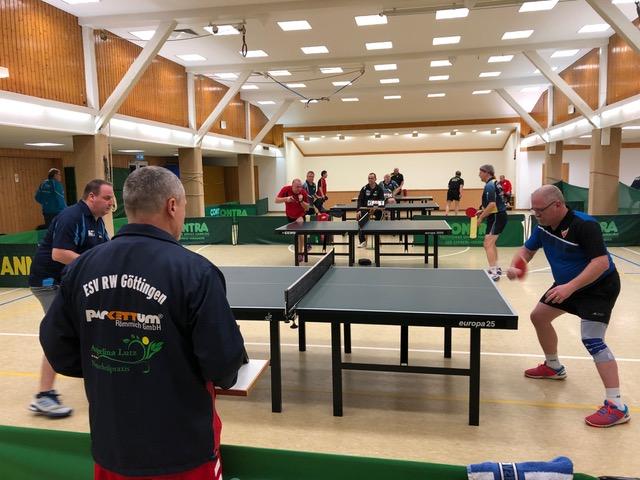 Bei den Ü 50 Oldies waren ebenfalls 4 Mannschaften zum Leistungstest erschienen: TSV Jühnde, TTC Hattorf, SV Rot-Weiß Hörden und TTC Lonau. Abschließend kam es zum showdown der ungeschlagenen Mannschaften aus Jühnde (Elend, Ramszweig, Gerth) gegen Hattorf (Tront, Barke, Pfeiffer). Nach einem ausgeglichenen Beginn war das Doppel vorentscheidend. Hier setzte sich die Jühnder Paarung Gerth/Ramszweig gegen Pfeiffer/Tront zum 3:1 Zwischenstand durch. Den entscheidenden 4. Punkt für Jühnde holte dann „Schraube“ Gerth gegen Roman Tront, nachdem vorher der bisher ungeschlagene Henning Ramszweig gegen den Hattorfer Barke den Kürzeren gezogen hatte.