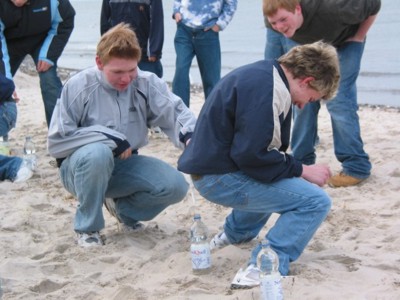 Ein etwas außergewöhnliches Spiel sorgte bei den älteren Jugendlichen am Strand für Erheiterung, während sich die jüngeren Teilnehmer durch einen kleinen Hindernisparcours auf dem Parkplatz kämpfen mussten. Anschließend ging's wiederum in die Schwimmhalle und auf den Hartplatz, und auch die ersten Ideen für die TTFZ_2005_06Jubiläumsshow am Freitag nahmen Gestalt an. Am Abend nahm dann das Betreuerteam die Herausforderung der Teilnehmer auf ein Freundschaftsspiel an - und geriet mit 9:2 unter die Räder. Dazu an dieser Stelle noch einmal "Herzlichen Glückwunsch" - der Sieg ging durchaus in Ordnung. Allerdings zweifeln die Betreuer natürlich daran, dass dieses Ergebnis unter normalen Bedingungen genauso zustande gekommen wäre. Also, Jungs, wann und wo steigt das Rückspiel??? Und weil dies der erste Tag der Freizeit mit richtig schönem Wetter war, ging's abends noch auf Nachtwanderung nach Rettin - wieso die Kids danach wohl so völlig problemlos eingeschlafen sind???